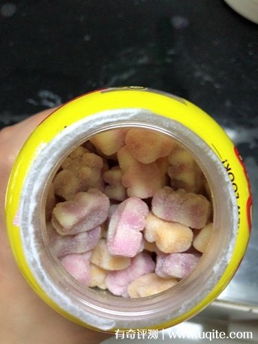 產(chǎn)品到手后就還挺大一瓶的,而且里面的小熊糖是軟糖的形式,口味也是由三種口味組成,孩子看到后還挺喜歡的。期間我有嘗過一顆,味道還挺不錯(cuò)的,酸酸甜甜的還很有嚼勁,就像是在吃QQ糖一樣。