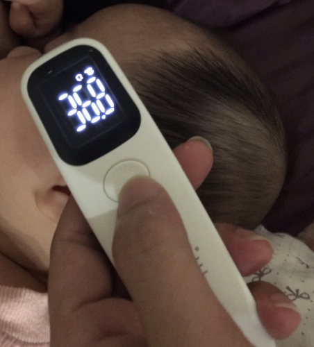它的使用方法也非常的簡(jiǎn)單,一鍵式開(kāi)關(guān),打開(kāi)之后,它有一個(gè)高清的顯示屏?xí)詣?dòng)亮起,測(cè)量的時(shí)候只需要將測(cè)頭對(duì)準(zhǔn)孩子的額頭即可,不到三秒鐘不到溫度計(jì)就立馬測(cè)出來(lái)了,速度非常的快,有點(diǎn)出乎我的意料了,為了驗(yàn)證它的精準(zhǔn)度,連續(xù)測(cè)量了三次,結(jié)果都差不多。