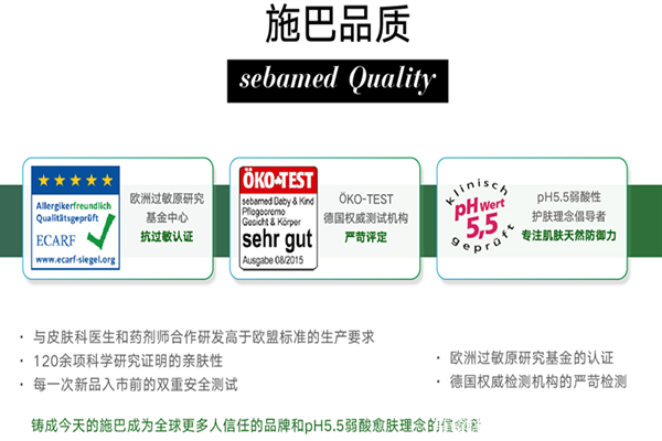 施巴(Sebamed)是來自德國的一個老品牌,也是醫(yī)學美容的第一健康品牌,該品牌致力于追求pH5.5弱酸性的健康護膚理念,保護皮膚天然油脂膜,提升肌膚自身儲水度和治愈力的“肌”本功,從而強健肌膚天然防御力。在產(chǎn)品質量安全成分方面,旗下所有商品都是符合歐盟國家標準的,可以放心使用。其中施巴嬰幼兒專用物理防曬,就是他們家銷量很不錯的一款產(chǎn)品,下面就來看看這款施巴兒童防曬霜好用嗎?