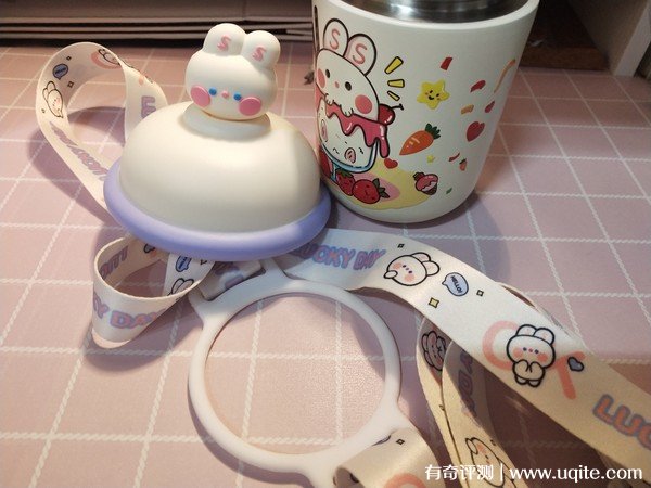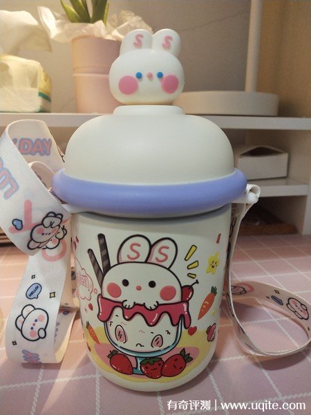 這款水杯我完全是在網(wǎng)上看到后因?yàn)轭佒等胧值?,太戳我了。到手還配套有背帶,不過我倒是沒有那么“不要臉”,出門沒用背帶,小孩子用估計(jì)會(huì)很方便。