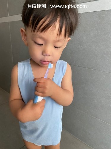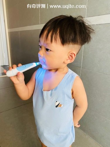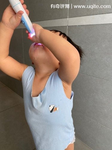 它打開之后的振動頻率不算高,比我們自己用的電動牙刷慢了很多,振動感也沒那么強,挺溫和的,這一點我很滿意的,因為我挺怕一個用力過猛,給他刷破皮,但目前沒出現(xiàn)意外。