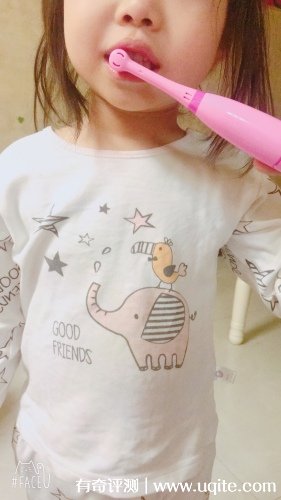 操作方面很簡單,一鍵啟動,孩子自己就會用,機身工作的時候有振動感,但比大人用的電動牙刷振動感小很多,頻率沒那么快,不容易損傷牙齦。它和我們用的電動牙刷不太一樣,還會旋轉,挺有趣的。