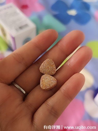 藥片是灰白色的質(zhì)地,形狀是三角形的,顆粒不大,嚼起來有一股酸酸甜甜的味道(我有嘗過),孩子倒挺愛吃的,一點(diǎn)也不排斥。