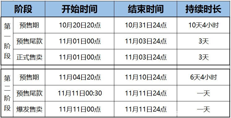 今年雙十一共分為兩輪,具體時(shí)間如下,而本輪雙十一紅包使用日期就在正式售賣(mài)期11.1—11.3與11.11當(dāng)天,可作為現(xiàn)金抵扣(尾款也可使用)。