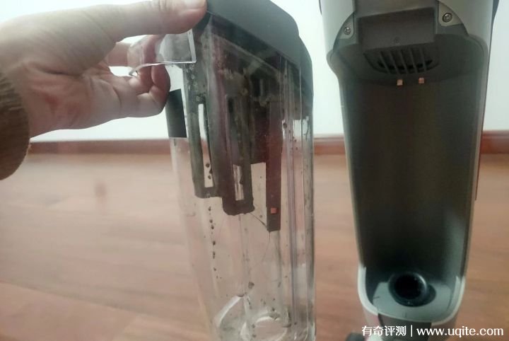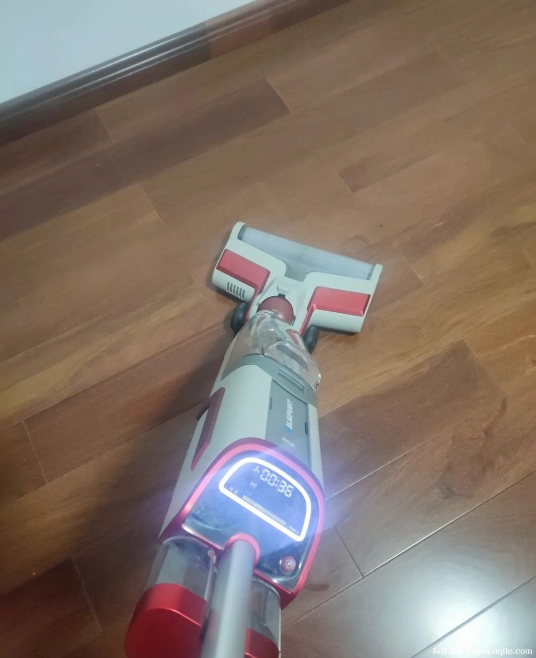 操作方面也簡單,把手處有個按鍵,按住就噴水,不按的話就是干吸,吸力很大,各種頭發(fā)、灰塵和碎屑都能吸起來,也不纏頭發(fā)。白天清理的時候,考慮到還要走來走去,怕又弄臟,一般都是干吸,晚上才拖。