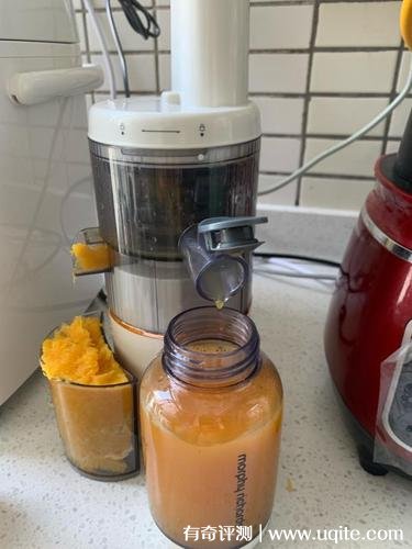 摩飛榨汁機的操作還是蠻簡單的,一鍵開機就可以了,它的底部是有兩個出口的,一個出果渣,一個出果汁,這款榨汁機很好的一點是,它在榨果汁的時候不用加水,榨出來是純果汁,喝著口感很不錯。
