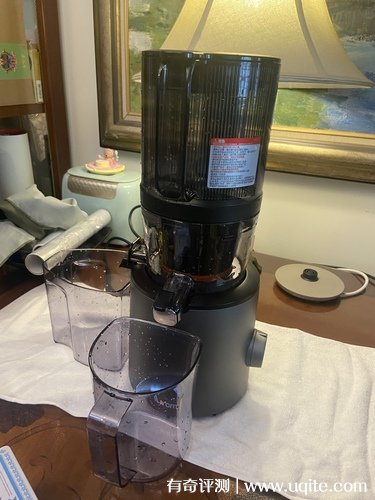 hurom惠人原汁機的操作很簡單,就一個旋轉(zhuǎn)開關(guān),沒啥復(fù)雜的按鍵,它有一個出果汁的口,還有一個出果渣的口,剛到手的時候我就用它榨了一個葡萄汁,我在榨汁的時候沒有加一點水,果汁榨出來口感又細膩,顏色又純正,而且出來的果渣都是干的,沒有一點水分。