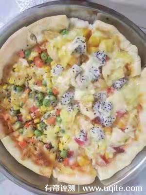 我那天心血來(lái)潮,還用它烤了一個(gè)披薩,出來(lái)的成品還是不錯(cuò)的,雖然沒有外面賣的那么精致,但面餅吃著也很有嚼勁,還是拉絲的那種。