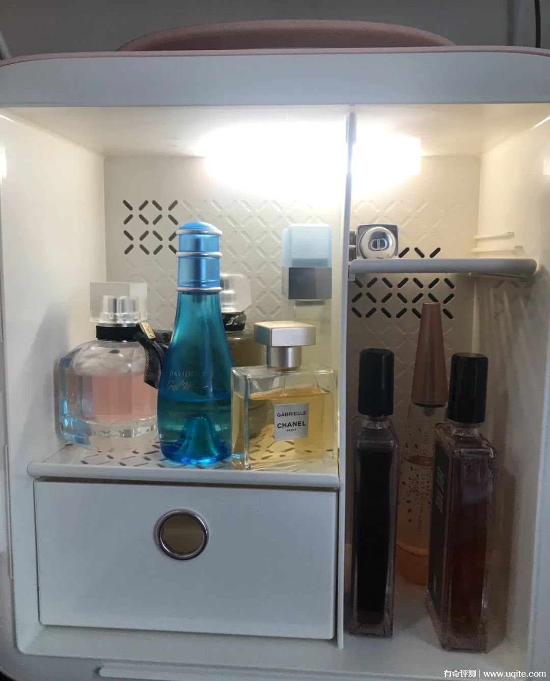 歌嵐美妝冰箱實物沒讓我失望,很有質(zhì)感,小小的,不占地方,但放小東西又很能放,水乳平時經(jīng)常用,就沒放進(jìn)去,香水、口紅、唇膏、面膜放進(jìn)去完全沒問題,還有多的地方。