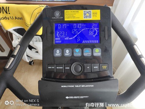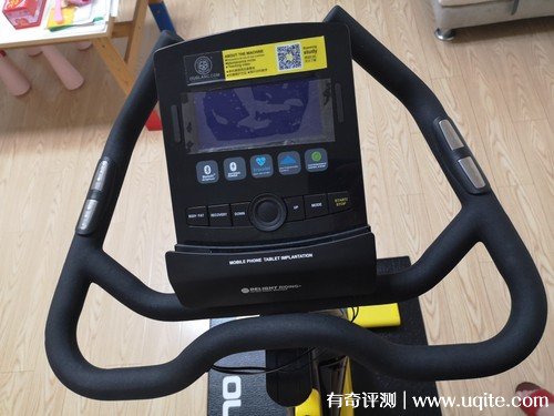 機身正中有一個智能顯示屏,在你運動的時候,它可以舒適的檢測運動的速度、時間、卡路里,同時手握式的心率測試儀,也會顯示你的身體狀況,使用了不到二十分鐘,自己的已經(jīng)全身都濕透了,效果還是很明顯的,雖然有一點聲音,但不是很大,可以原諒,所以歐寶龍動感單車好嗎?效果和質(zhì)量沒得說。