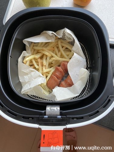 我第一次使用這款飛利浦空氣炸鍋是炸的薯條和烤腸(感覺不容易出錯),而且在炸之前,我真的就只是在底部刷了一點的食用油,本來還現(xiàn)在應(yīng)該會有焦糊或者是炸出來口感不好的問題,但是沒想到出來以后受熱還挺均勻的,薯條的色澤很完美,并且入口外酥里嫩,口感完全不輸于油鍋炸的口感。