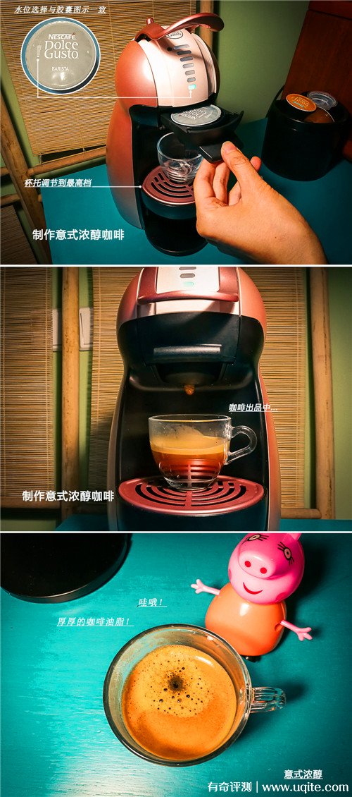 我一次買了三種膠囊,首先登場的是我最喜歡的濃縮咖啡。意式濃縮是一切花式咖啡的基礎(chǔ),厚厚的咖啡油脂靠的是咖啡機(jī)的壓力把精華萃取出來,小企鵝雀巢膠囊咖啡機(jī)的壓力是15bar,意式咖啡的標(biāo)準(zhǔn)高壓。膠囊上標(biāo)示有水量提示,只需要把小企鵝雀巢膠囊咖啡機(jī)的出水量調(diào)節(jié)到與膠囊標(biāo)示一致。這個意式濃醇是最低一檔水位,調(diào)節(jié)好水量后再把杯托調(diào)節(jié)到最高檔位,放上濃縮杯,把撥桿撥至右邊熱水區(qū),小企鵝雀巢膠囊咖啡機(jī)立即開始工作,聲音非常小哦!不到一分鐘,一杯擁有厚厚咖啡油脂的意式濃醇就做好啦!一口下去,苦苦的味道被豐腴的油脂化開,濃郁香醇,唇齒回甘。
