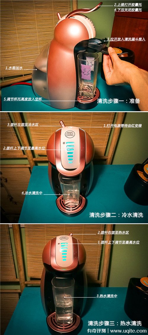 美美欣賞一翻,迫不及待開始使用啦!首次開機(jī)需要清洗,簡單簡單:水箱加滿水,放個大杯子接水,然后把清洗漏斗放入膠囊托(漏斗作用應(yīng)該是防止水花四濺),開機(jī)后上下?lián)軇訐軛U調(diào)節(jié)水量至最高水位,然后向左撥動撥桿至冷水區(qū),冷水沖洗開始。沖洗完畢再次調(diào)節(jié)水量至最高水位,向右撥動撥桿至熱水區(qū)域,熱水沖洗開始。完畢,倒掉廢水,準(zhǔn)備就緒,整個過程不到五分鐘。