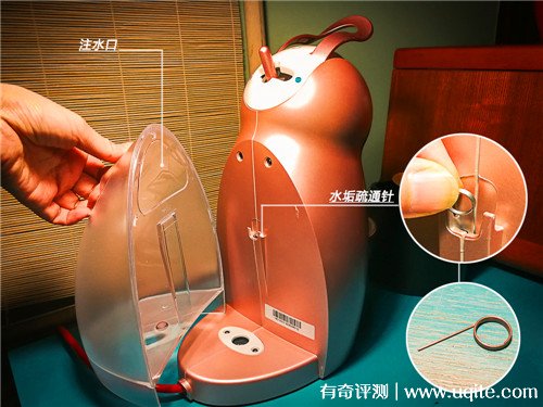 小企鵝雀巢膠囊咖啡機(jī)的背部是個透明大水箱,可以隨時觀察水位,有提手方便換水。背部還隱藏了一顆疏通針,入水口被水垢堵塞的時候就用這個針疏通,當(dāng)然最好還是用純凈水啦。嗯,就是這樣,沒有復(fù)雜的設(shè)計,小企鵝善解人意,讓你一看就懂!