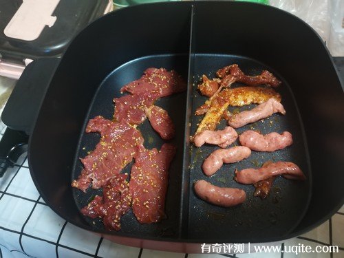 山本電火鍋除了燉煮火鍋以外,它還可以用來烤肉、攤餅和煎蛋,雖然中間有一個隔斷,但也不妨礙使用,所以實用性就還挺多的。