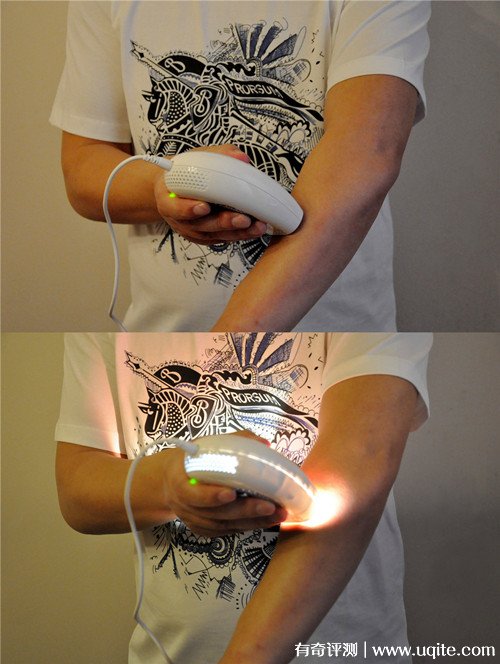 絲可脫毛儀的具體操作也很簡單,提前1-2天剃除表面毛發(fā),調整合適的檔位,對準毛發(fā)部位按下閃光開關即可(注意手還需要同時接觸背面的金屬片)。 才開始使用時,我沒掌握方法,沒能發(fā)出紅色閃光,也沒滴的一聲提示,咨詢客服才知道,需要將出光口完全緊貼肌膚,只要有縫隙就不行。