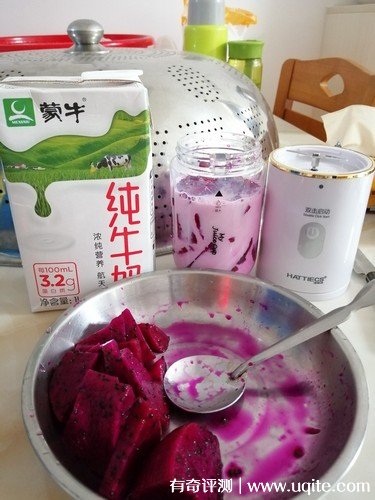 具體效果還是要看榨汁,來(lái)榨個(gè)火龍果奶昔,將火龍果切小塊放入杯中,倒入牛奶,再將海蒂詩(shī)榨汁機(jī)底座倒扣在杯上擰緊,正過(guò)來(lái)就可以榨汁了。