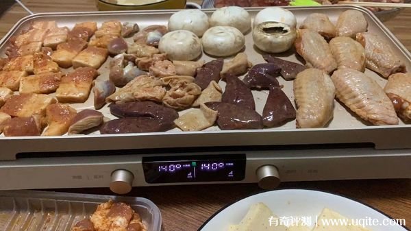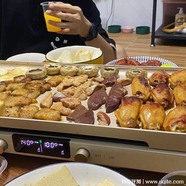 我最初買它主要是為了烤肉,兩個人找個小桌子坐著,也挺有烤肉店的感覺了。盤足夠大,比烤肉店的盤更能放,鋪滿后兩個人吃都根本趕不上烤的速度。它打開后升溫蠻快的,冷油冷肉放上去,一會就開始起細微泡泡,發(fā)出滋滋滋的烤肉聲音。每邊熱量都挺均勻的,看我們雞翅就能看出來,沒來得及吃也沒注意翻面,就都有那么點糊了。