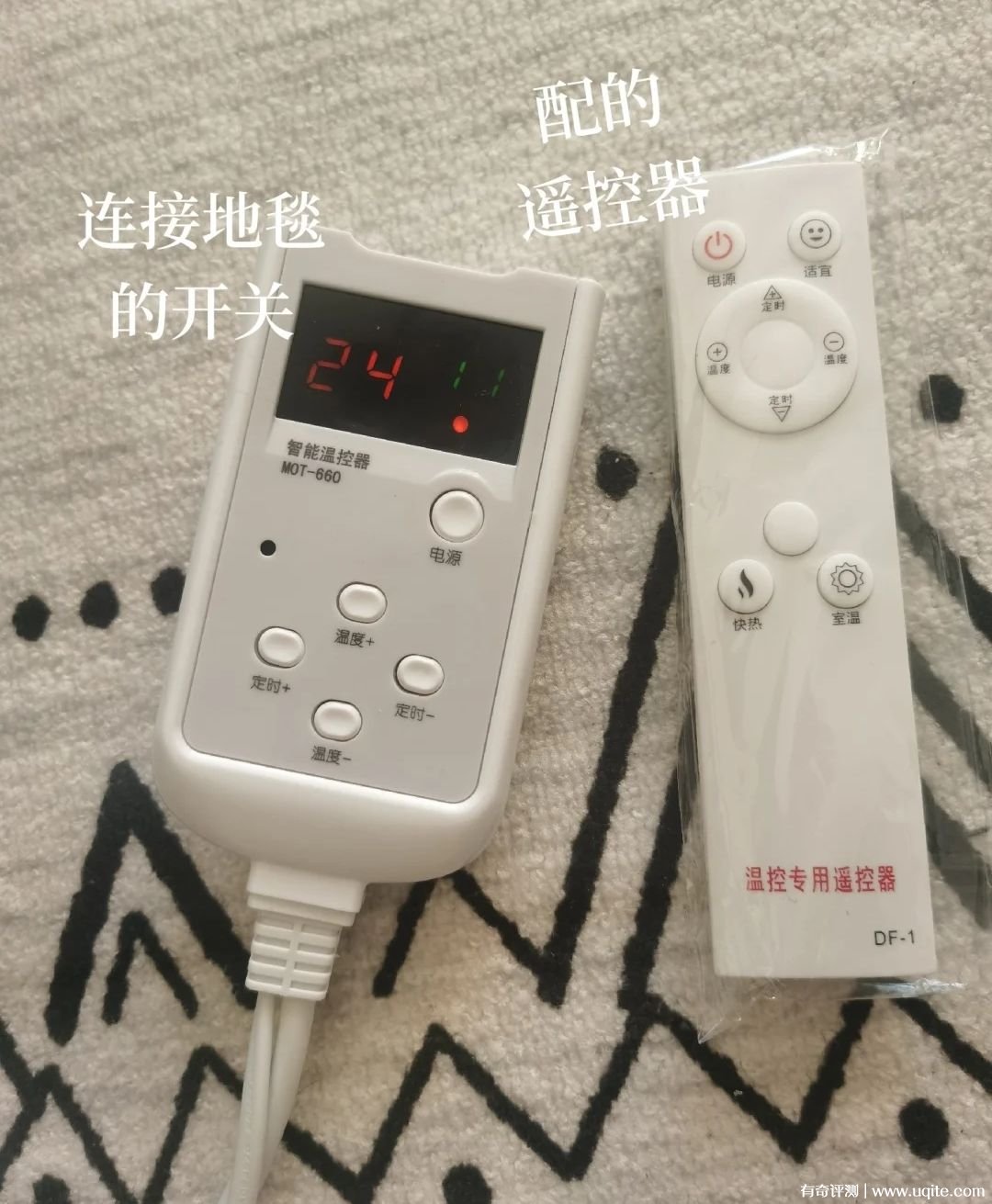 卓碩石墨烯電熱地毯我們買的是普通款,不是可以拆卸的,價(jià)格稍微便宜些。它還挺厚實(shí)的,表層毛絨的,很柔軟,走線封邊做工都挺齊整,連上電源就可以用了。除了電源線上有個(gè)控制器,還配套了一個(gè)遙控器,很方便。