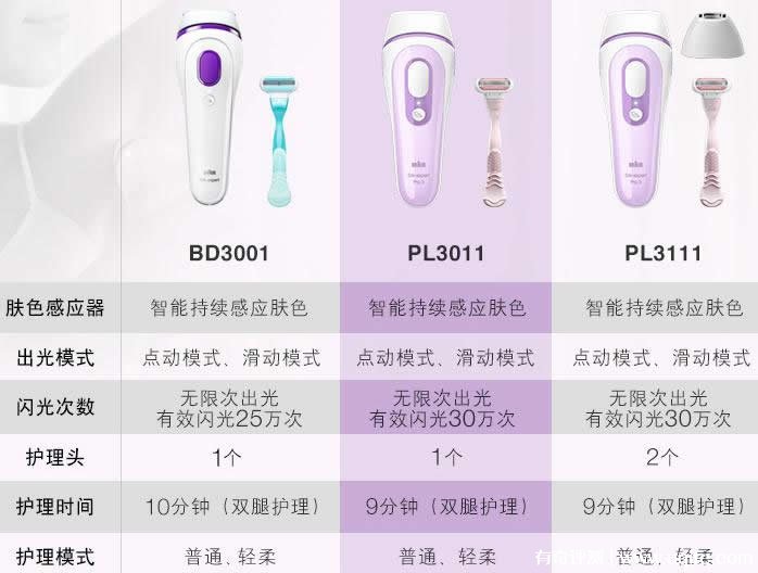 上圖中博朗脫毛儀各項(xiàng)參數(shù)和性能區(qū)別已經(jīng)一幕了然,三者區(qū)別并不大,如果不考慮價(jià)格,選擇PL3111最好,如果考慮價(jià)格和性價(jià)比的話,選擇PL3011,綜合考慮:性價(jià)比最高的就是中間的PL3011(2299元),大家可以根據(jù)自己的需求來選擇。