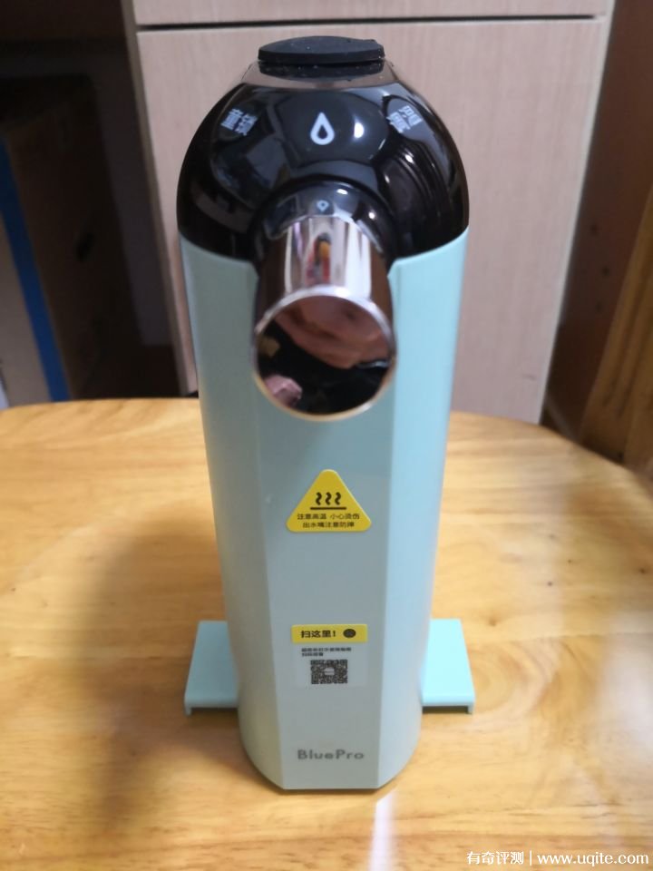 操作起來非常簡單。將礦泉水瓶放好后,為機器通電(插電式),然后輕觸“調(diào)溫”鍵,選擇溫度,有六個檔位的水溫可選,都是3秒出水(功率1500w)。輕按水滴鍵1秒自動出水150ml,輕按3秒自動出水300ml。出水流速,對于一款即熱飲水機來說個人覺得完全可以接受。長按童鎖鍵,可開啟、關(guān)閉童鎖功能(兒童鎖為了防止兒童燙傷)。