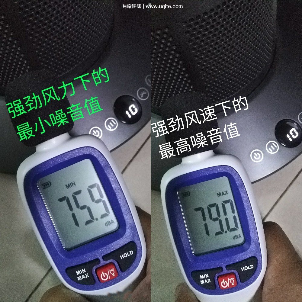 接著選擇10(強勁)檔的話,最低值為75.9分貝,最高值為79分貝。