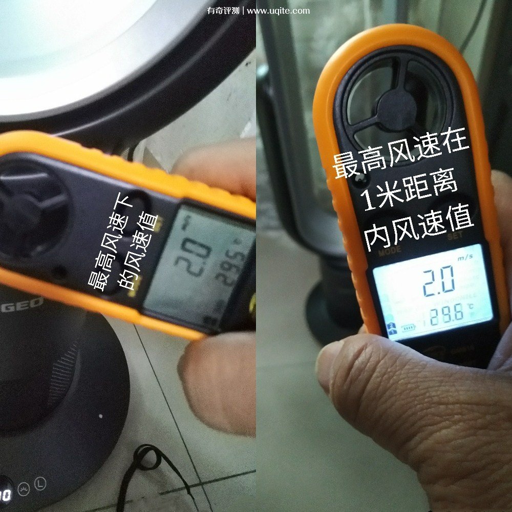 接著測試風(fēng)速了。打風(fēng)速儀,測試一下環(huán)形中間,呵呵!竟然是沒風(fēng)的。把風(fēng)速儀移到環(huán)形出風(fēng)口,只見風(fēng)速儀上面的讀數(shù)為2.0m/s,接著遠離一米的距離繼續(xù)測試,讀數(shù)依舊是2.0m/s,一點也沒衰減,利害利害。接著再次選回01檔,此時風(fēng)速儀讀數(shù)為1.4m/s到環(huán)形出風(fēng)口,只見風(fēng)速儀上面的讀數(shù)為2.0m/s,接著遠離一米的距離繼續(xù)測試,讀數(shù)依舊是2.0m/s,一點也沒衰減,利害利害。接著再次選回01檔,此時風(fēng)速儀讀數(shù)為1.4m/s