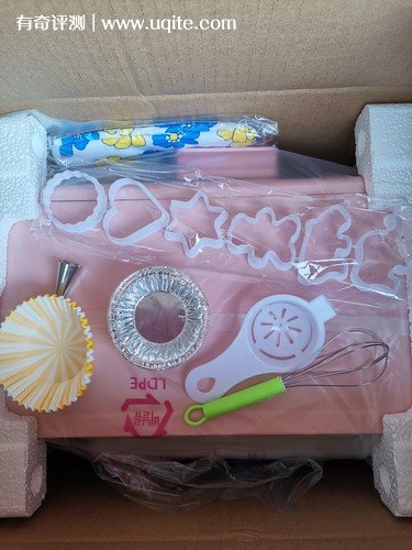 它到手的時候還送了好多烘焙用品,還挺劃算的??鞠浔旧碇亓亢茌p,平時不用的時候我就放在了微波爐上面了。