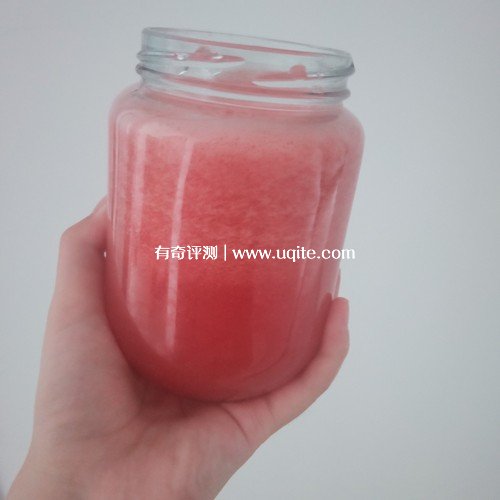 我最近榨得比較多的是西瓜汁,大概二十秒的樣子就好了,西瓜籽也能打碎,成品和奶茶店沒區(qū)別,西瓜先在冰箱里冰一冰再榨,這種天氣喝真的好爽!