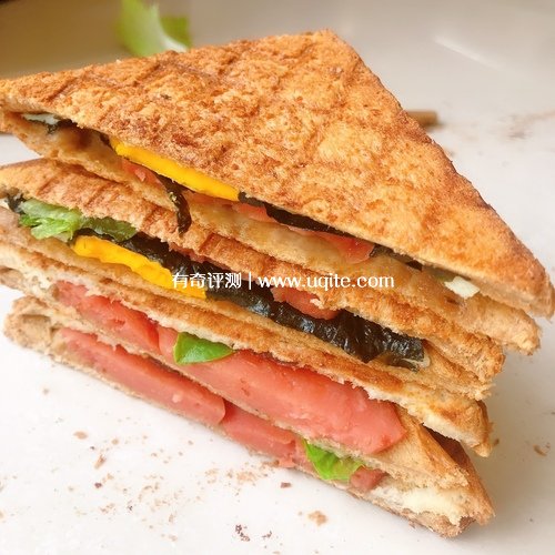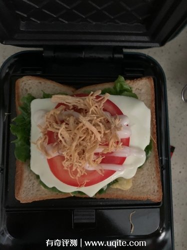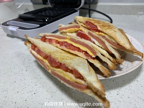 第二天一大早我就購買了食材,開始做三明治了,預熱烤盤不用放油,一個三明治差不多三分鐘的時間就能做出來,如果喜歡吃焦一點的朋友,可以再多烤一會,但最好不要超過五分鐘,小心會糊掉,烤華夫餅也很快,將自己調的華夫餅原液倒上去,很快就能成型。