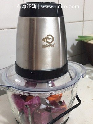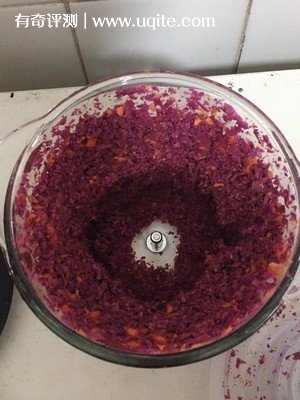 打個(gè)紫薯胡蘿卜泥試試,這個(gè)效果非常出乎意料,畢竟紫薯是比較硬的,絲毫不輸胡蘿卜,但可以明顯看到紫薯被打得很細(xì)膩,胡蘿卜是比較小的塊狀,所以這個(gè)還是得看食材的軟硬度吧。