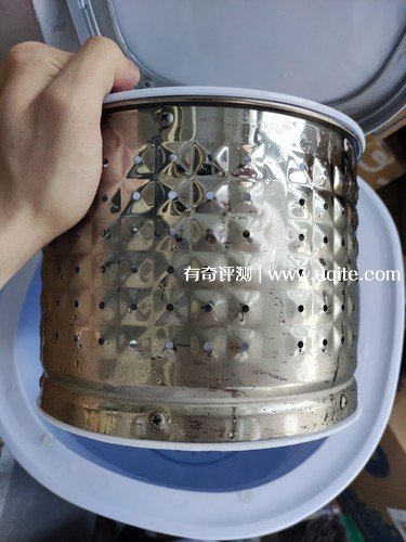 洗衣機的外型說實話有點像一個帶蓋的垃圾桶,但是容量還是很大的,夏天穿的T恤基本上可以容納十件左右,像外套這種厚一點的衣服也能洗兩到三件,洗衣機的外包是是塑料材質的,但是質量很好,內里可以放一個不銹鋼的瀝水籃,是用來甩干的,很結實。