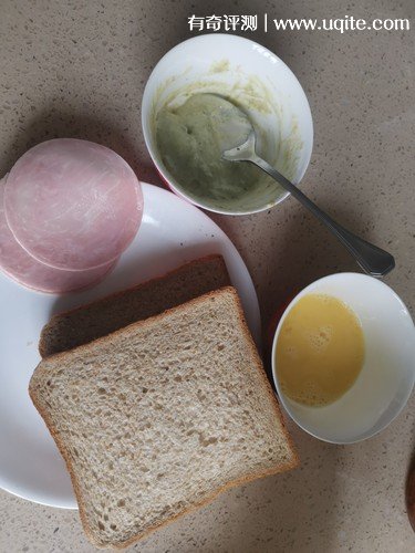 當(dāng)然顏值、烤盤也不能決定其功能的強大,還得烤出來試試看。先把材料準備好,面包、火腿、雞蛋等,想吃什么自己準備就行。