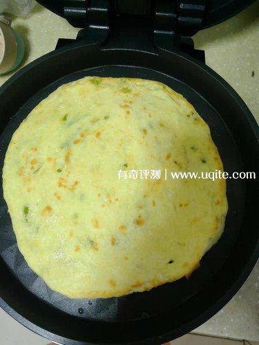 當(dāng)然不管怎么說,還是現(xiàn)場制造來得實(shí)在。先來個(gè)雞蛋灌餅,煎雞蛋是很考驗(yàn)火力均勻的,因?yàn)樘菀卓竞?,但九陽電餅鐺就不存在這個(gè)問題,煎出來的雞蛋很嫩,就是木鏟不太行,需要筷子幫忙。