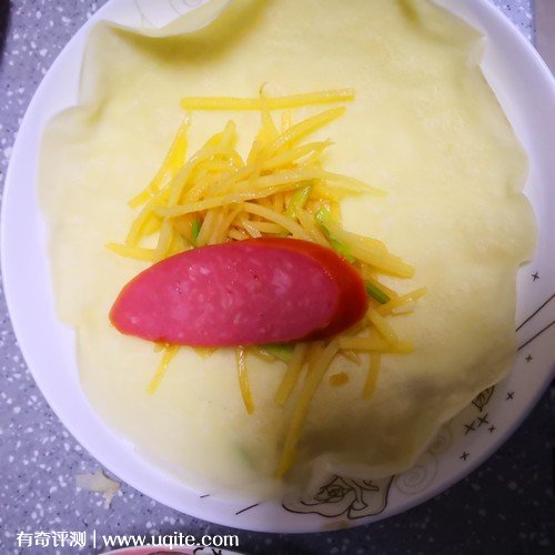 薄餅做出來當(dāng)然得上點(diǎn)輔料吃,跟吃雞蛋卷餅一樣,來點(diǎn)土豆絲、香腸,一卷,美味就到手。