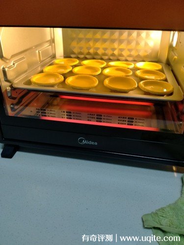 第一次上手操作,選擇的是最簡(jiǎn)單的蛋撻制作,將調(diào)制好的蛋撻放進(jìn)去之后,就開始靜靜的等待成果啦!烤了差不多十幾分鐘的樣子,隔著烤箱就可以清楚的看到里面的蛋撻液已經(jīng)開始成型了,看著就食欲滿滿。