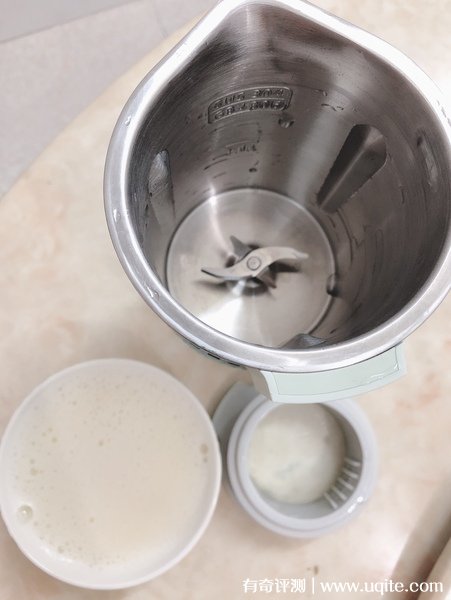我挺滿意它的一點是打豆?jié){都不用泡豆子,打出來的豆?jié){很醇厚,很細膩的感覺。使用過程中聲音并沒有宣傳所說的那么小,但比以前家里用的打豆?jié){機還是好一些,有時候晚上放在廚房提前預約了,朦朧中能聽到點聲音,但不至于把我吵醒的程度。