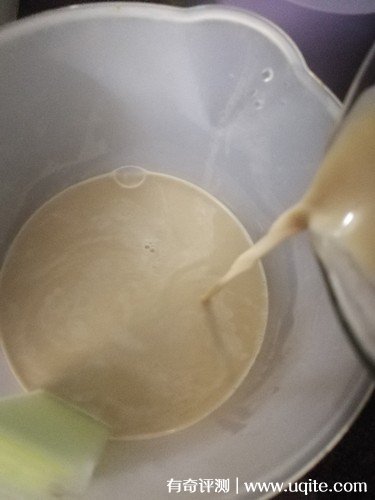 在磨豆?jié){前,我一般會(huì)把豆子泡一下,這樣可以減少刀片的磨損速度。磨出來(lái)的豆?jié){,豆渣很少,基本上是可以忽視的那種,看看這倒出來(lái)的效果就知道口感一定很不錯(cuò)。