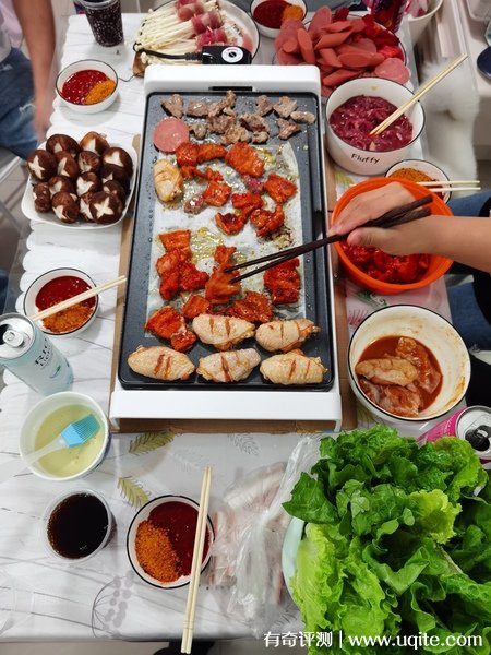 到手之后我們已經(jīng)烤了四五頓肉了,每次幾十不到一百塊的材料,能吃到撐,還是比去外面吃省錢(qián)很多的,而且在網(wǎng)上買(mǎi)了點(diǎn)蘸料,再學(xué)了學(xué)網(wǎng)上的腌制方法,味道也沒(méi)差別,挺不錯(cuò)的。除了烤肉,平時(shí)用它煎個(gè)雞蛋烙個(gè)餅也蠻方便的,升溫很快。