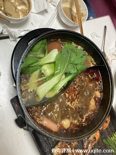 至于火鍋,它是鴛鴦鍋,把火鍋底料加進(jìn)去,不到十分鐘就加熱好了,速度也挺快的,而且它的鍋底很深,也不用擔(dān)心湯會(huì)溢出來。