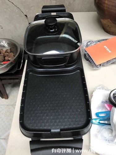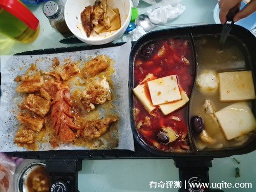 至于火鍋,它是鴛鴦鍋的鍋型,它的鍋底挺深的,只要水不加多,溫度不過高,它是不會溢出來的,而且鍋的容量也很大,可以煮很多東西,它的加熱速度稍微要比烤盤慢一點,把火鍋底料加進(jìn)去,差不多要十分鐘。