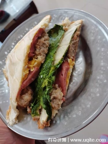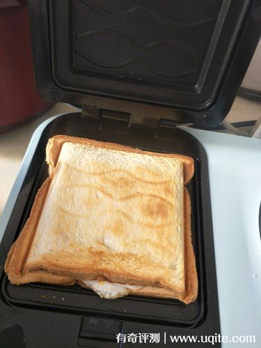 看看我做的三明治,色澤是不是很好,看著就很有食欲,它的速度也挺快的,我把食材放上去蓋好之后就會刷牙洗臉了(不到十分鐘),洗完了就做好了,需要注意的是在做三明治的時候要注意食材不要放太多了,不然不好封邊。