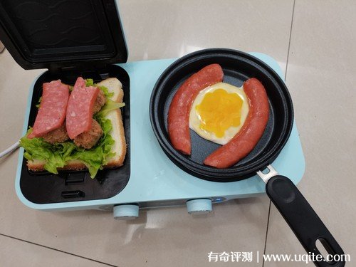 這款早餐機操作起來也挺方便的,左右分區(qū)雙旋鈕,只需要自己插上電調(diào)整溫度就可以了。將面包片放到三明治機這邊就可以了,然后再往上面填充食材,煎鍋可以用來煎雞蛋備用,非常方便省時。