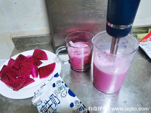 剛拿到產(chǎn)品的第一天晚上,我就用料理棒做了一個(gè)牛奶火龍果汁,攪拌速度很快,而且很均勻,基本上沒有什么殘?jiān)?,孩子也愛喝?/p>