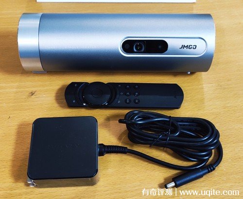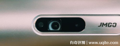 這款投影儀的設(shè)計是圓柱形的,體積不大,而且重量也很輕巧,如果出門攜帶也會很方便。投影儀的側(cè)邊是喇叭和開機(jī)按鍵,前方是投影攝像頭。