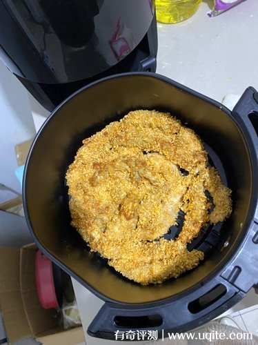 然后我又嘗試著炸了一塊雞排,剛開始還挺擔(dān)心的,因為外面買的雞排基本上都是油鍋炸出來的,所以像這種不放油直接炸的雞排,我不僅是第一次做,也是第一次吃。所以做好之后,在取出來的那一刻我還是很緊張的,但是沒想到,雞排不僅炸熟了,而且口感一級棒,香酥嫩,口感很有層次。