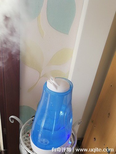它的操作還挺簡單的,旋轉式的開關,直接開啟就可以了,打開之后,它出水霧的速度還挺快的,基本上一打開后就可以有霧氣出來,差不多等到15-20分鐘左右,就可以很明顯感覺到室內的空氣變潮濕了,沒有之前那么干了,皮膚也不會說干到緊繃了。