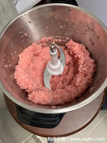 拿到絞肉機(jī)的當(dāng)天晚上我就趕緊用了起來,先是給孩子絞了點肉,用來做丸子湯的,絞肉絞肉的速度很快,動力很強(qiáng)勁,運(yùn)轉(zhuǎn)聲音也還好,不嘈雜。不到三分鐘一小盆肉就絞好了,而且肉質(zhì)很細(xì)粒,用來做丸子很好定形,不容易散,比我手剁的強(qiáng)多了。