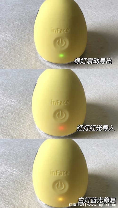inFace美容儀到手之后形狀真的有點像一個雞蛋一樣,拿在手里小小的,平時出門攜帶也很容易。這款美容儀一共有三種模式,綠燈是導(dǎo)出模式、紅燈是導(dǎo)入模式、白燈藍光是修復(fù)模式。操作起來也很簡單,打開開關(guān),選擇模式就可以直接上臉使用了。