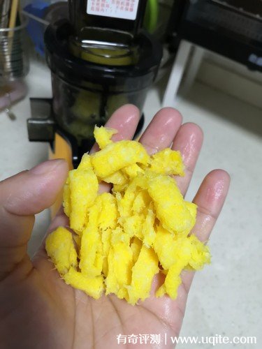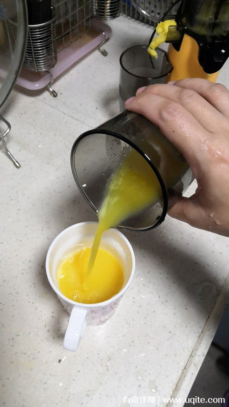 這款原汁機底部有兩個口,一個口用來出汁,一個口用來排渣,剛到手的時候我就用它榨了一個橙汁,榨出來的橙汁沒有加一滴水,果汁榨出來口感又細膩,顏色又純正,而且出來的果渣都是干的,沒有一點水分。
